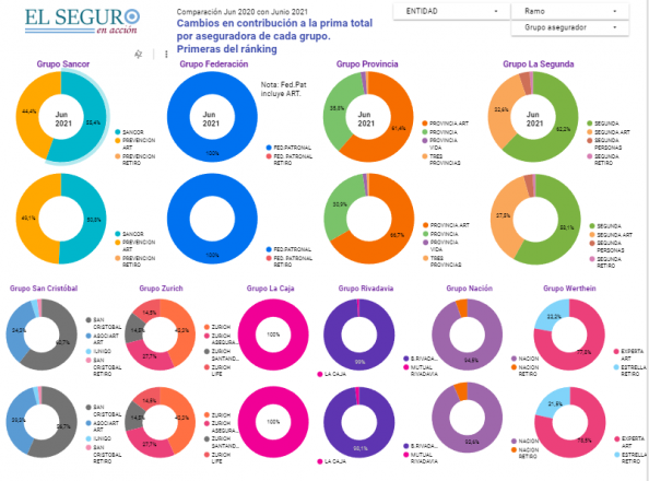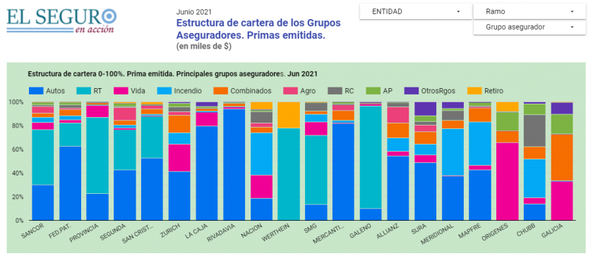 Por ejemplo, en el Grupo Provincia, los seguros de Automotores tenían una participación porcentual en el total de la cartera de 20% a junio de 2020. Esta proporción ascendió a casi 23% en junio 2021. De la misma manera, Riesgos del Trabajo perdió participación: pasó de 70% en 2020 a 64% en 2021.