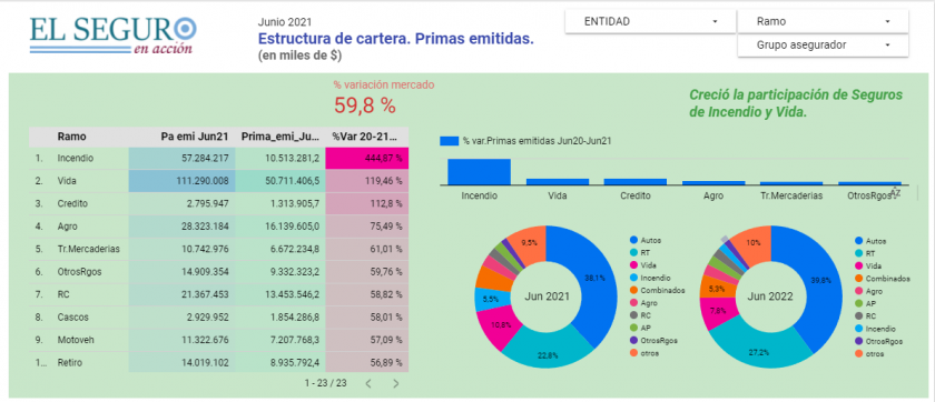 Así, tenemos que Incendio incrementó sus primas más de 400%, Vida 119%, Seguros de Crédito 110%, Agro 75%, y Transporte de Mercaderías 61%. Estos ramos crecieron por encima de la variación promedio del mercado que se ubicó en 60%.